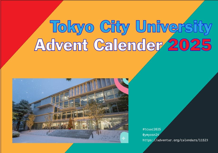 ついに始まりました!Tokyo City University Advent Calendar 2025!! 2019年、東京都市大学デジタルコンテンツ研究会のOJさんによって始まり、2020年と2021年は同デジコンのmikutaさん(以下デジコン省略)、2022年には山下マナトさん&だいごさんが、2023年はプムソンさんと裏をむぎゅさんが、2024年はにむにむさんが主催しました。